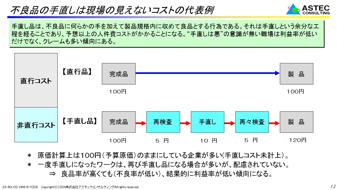 “見えないコスト”とは、原価計算上は計上されないコストのことです。見えないからこそ改善のメスが入り難いという特徴があり、高コスト体質企業の多くで対策が取られていないのが実態です。